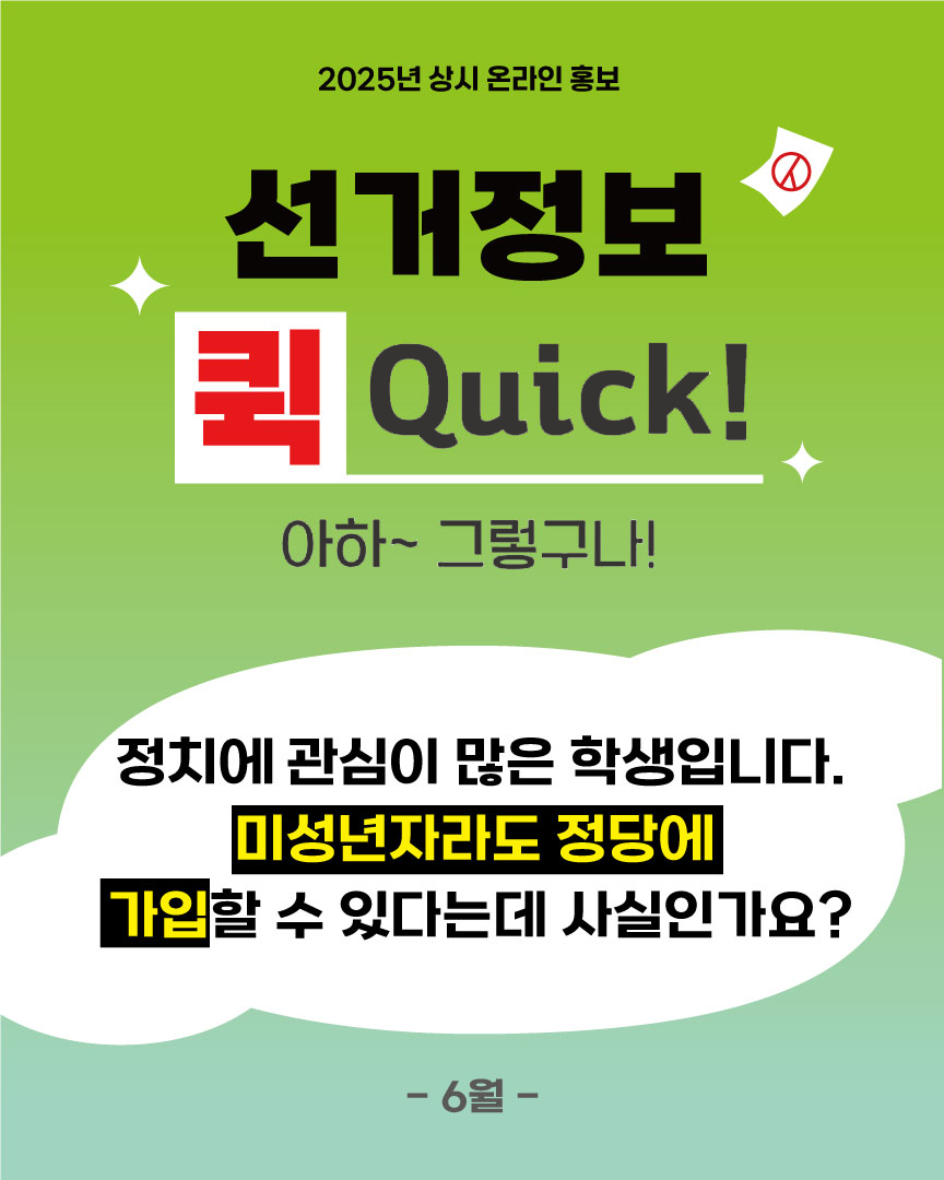 충청남도선거관리위원회(0414062085)에서 제작한 2025년 상시 온라인 홍보 선거정보 퀵 아하~ 그렇구나 6월편 저작물은 "공공누리" 출처표시-상업적 이용금지-변경금지 조건에 따라 이용할 수 있습니다. 자세한 내용은 [저작권정책]을 확인하십시오.