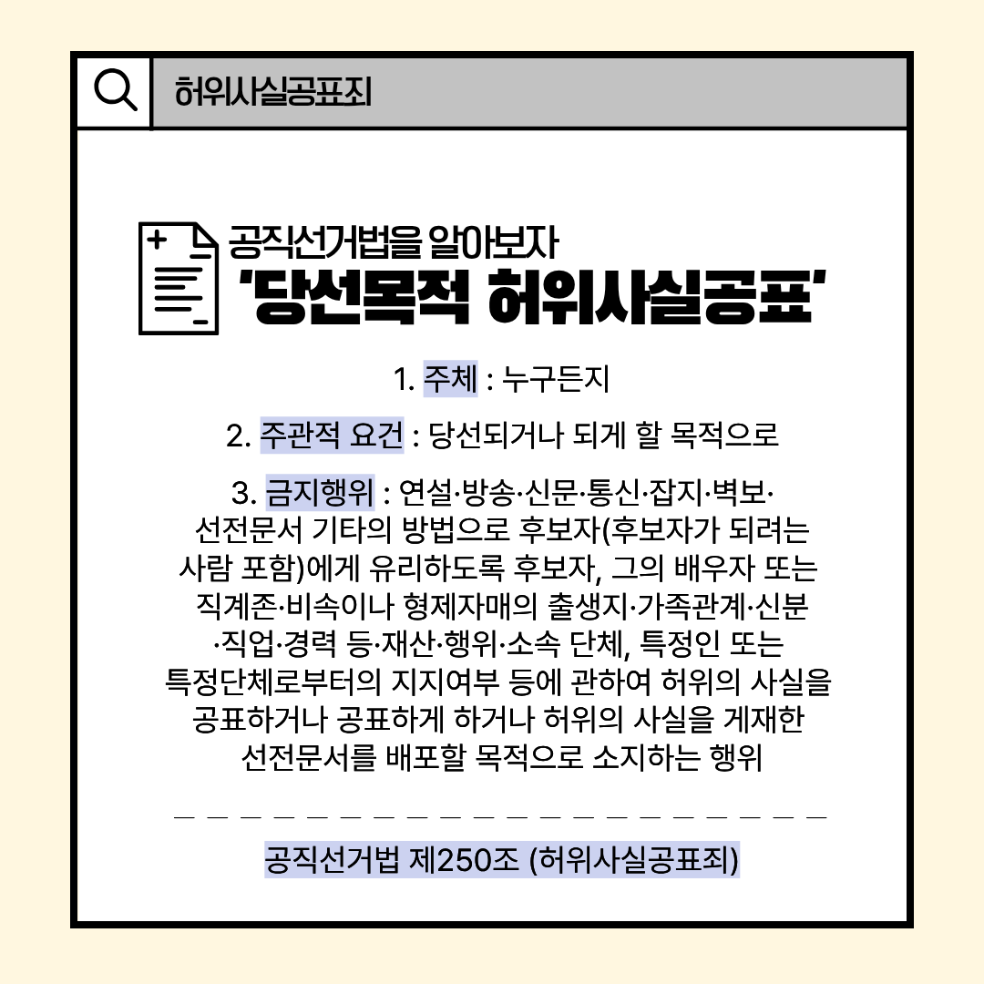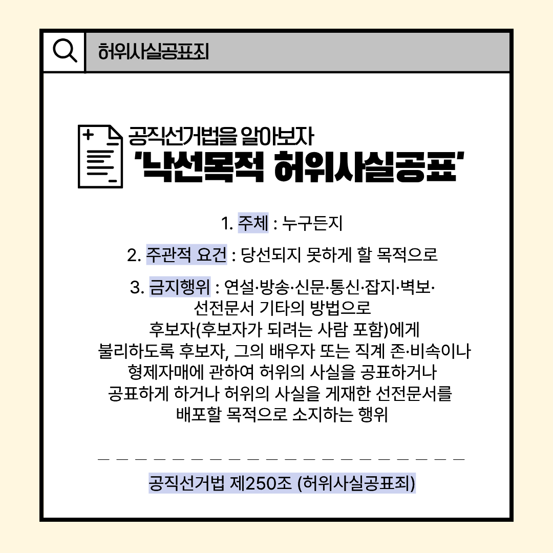 자세한 내용은 공직선거법 제250조(허위사실공표죄)를 참고하세요